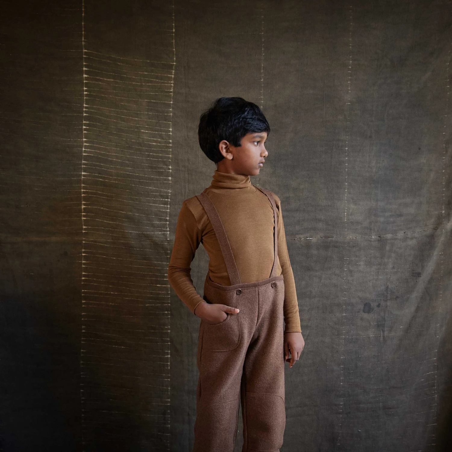 These boiled wool trousers are designed to be warm and sturdy, yet lovely and soft. Cut especially high waisted, they keep your child’s back and tummy warm and cosy. The wide cut leaves plenty of space for warm clothing underneath. Two braces help keep everything in place, and the pocket can be filled with treasures. With their reinforced knees and bottom, these boiled wool trousers are good for crawling and exploring.